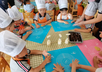 通过中秋节引出月饼,和小朋友互动提问讨论月饼相关话题。出示小朋友带的不同口味、品种的月饼,并说一说自己觉得月饼是怎样制作的,随后师生一起制作了月饼。